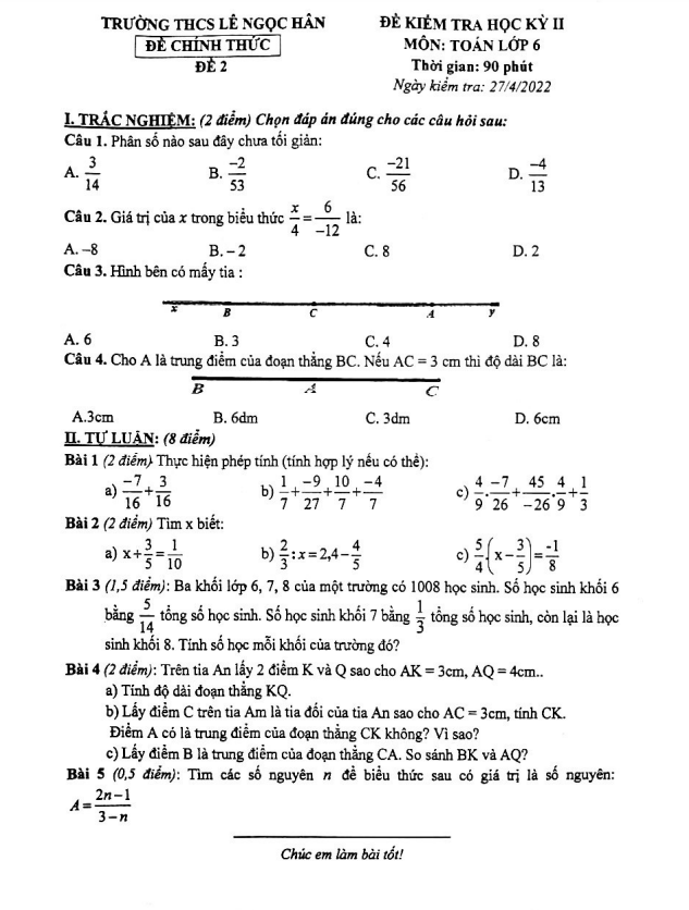Chào mừng quý thầy cô và các em học sinh lớp 6! Trong kỳ thi cuối học kỳ 2 môn Toán năm học 2021 – 2022 tại trường THCS Lê Ngọc Hân, chúng ta sẽ cùng làm quen với một số câu hỏi thú vị và bổ ích nhé.