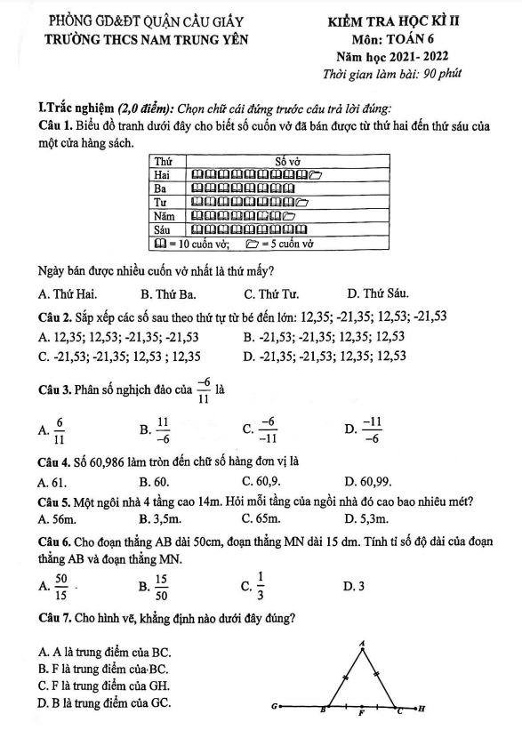 Chào quý thầy cô và các em học sinh lớp 6! Dưới đây là đề kiểm tra cuối học kì 2 môn Toán lớp 6 năm học 2021 – 2022 của trường THCS Nam Trung Yên, quận Cầu Giấy, thành phố Hà Nội.