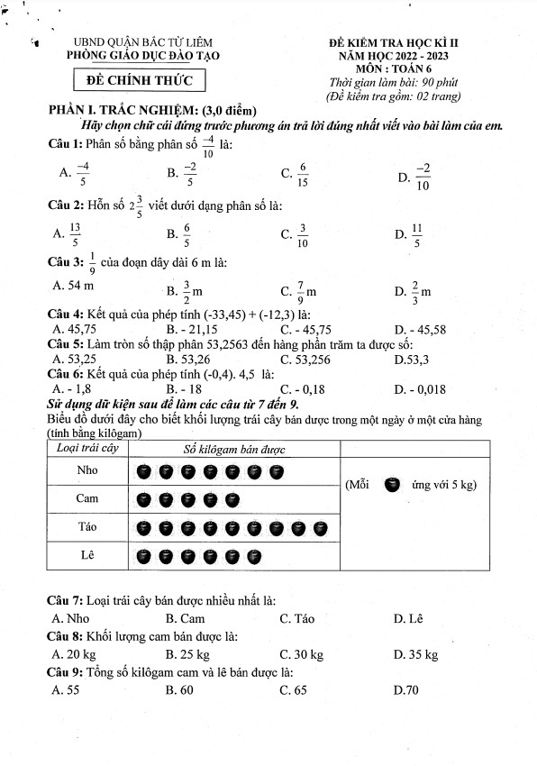 Đề học kì 2 (HK2) lớp 6 môn Toán năm 2022 2023 phòng GD ĐT Bắc Từ Liêm Hà Nội