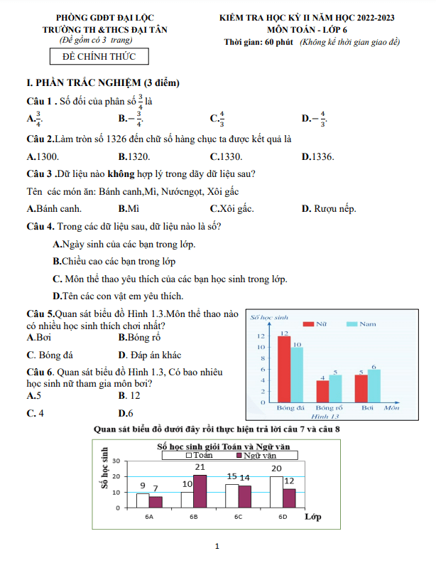Xin chào quý thầy cô và các em học sinh lớp 6! Hôm nay chúng ta sẽ cùng nhau tìm hiểu về đề kiểm tra cuối kỳ 2 môn Toán học lớp 6 năm học 2022 – 2023 tại trường TH & THCS Đại Tân, huyện Đại Lộc, tỉnh Quảng Nam. Đề thi này được thiết kế với cấu trúc 30% câu hỏi trắc nghiệm và 70% câu hỏi tự luận, thời gian làm bài là 60 phút (không tính thời gian giao đề), có đáp án và hướng dẫn chấm điểm.