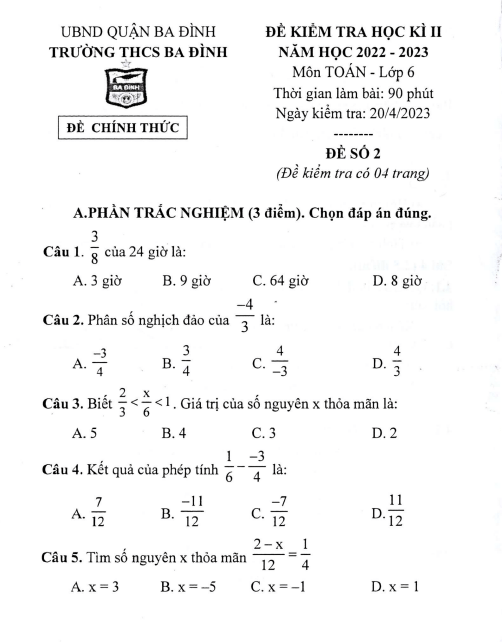 Chúc mừng đến với đề kiểm tra cuối học kỳ 2 môn Toán lớp 6 năm học 2022-2023 tại trường THCS Ba Đình, Hà Nội. Đề thi bao gồm 30% câu hỏi trắc nghiệm và 70% câu hỏi tự luận, với thời gian làm bài là 90 phút. Kỳ thi sẽ diễn ra vào ngày 20 tháng 04 năm 2023.
