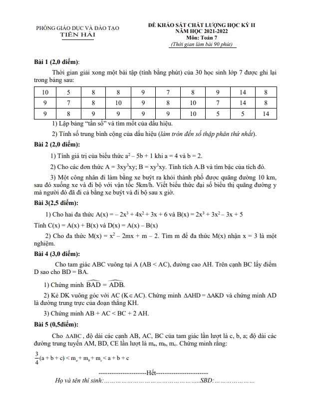 Nội dung dưới đây là thông tin về bài thi Đề học kì 2 (HK2) môn Toán lớp 7 năm 2021-2022 tại phòng Giáo dục và Đào tạo Tiền Hải, Thái Bình.Sytu xin gửi đến quý thầy cô giáo và các em học sinh lớp 7 đề khảo sát cuối học kỳ 2 môn Toán. Đề thi bao gồm 01 trang với 05 bài toán tự luận, thời gian làm bài là 90 phút. Đề thi có đáp án, lời giải chi tiết và hướng dẫn chấm điểm.Một trong các câu hỏi trong đề thi là về thời gian giải xong một bài tập của 30 học sinh được ghi lại trong bảng, yêu cầu học sinh lập bảng tần số và tìm mốt của dấu hiệu.Câu hỏi tiếp theo là về viết biểu thức đại số biểu diễn quãng đường mà một công nhân đi được bằng xe buýt và đi bộ trong một khoảng thời gian x.Cuối cùng, câu hỏi đưa ra một bài toán về tam giác và yêu cầu học sinh chứng minh một điều kiện cho tam giác đó.Đây là những bài toán thú vị và mang tính logic cao, giúp học sinh rèn luyện tư duy và khả năng giải quyết vấn đề. Đề thi Đề học kì 2 môn Toán lớp 7 năm 2021-2022 nhất định sẽ là thách thức đáng giá cho các em học sinh.