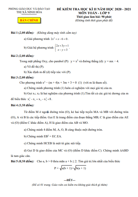 Sytu xin gửi đến các thầy cô và các em học sinh lớp 9 đề kiểm tra chất lượng học kỳ 2 môn Toán lớp 9 năm học 2020-2021 của phòng Giáo dục và Đào tạo thị xã Ninh Hòa, tỉnh Khánh Hòa. Đề thi bao gồm đáp án, lời giải chi tiết và hướng dẫn chấm điểm.
