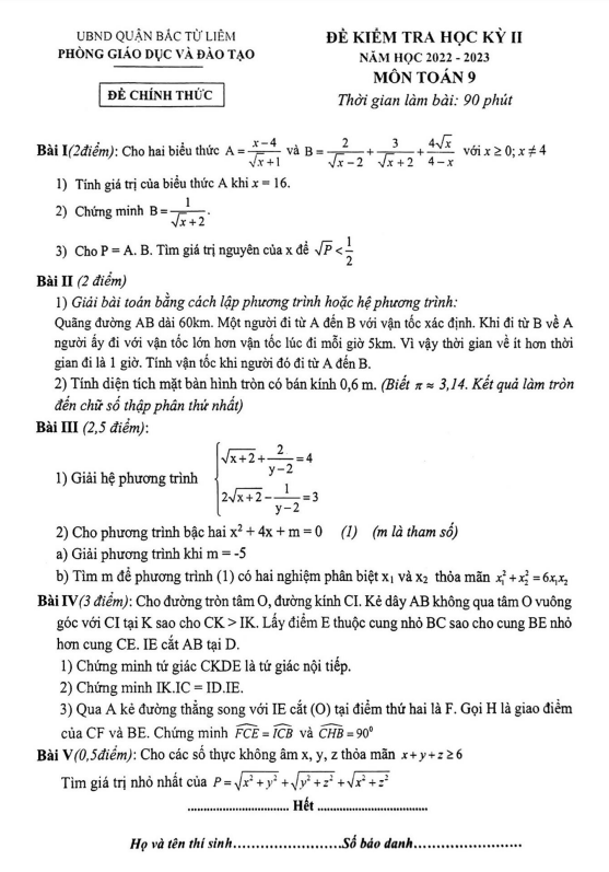 Đề học kì 2 Toán lớp 9 năm 2022 – 2023 phòng GD&ĐT Bắc Từ Liêm – Hà Nội