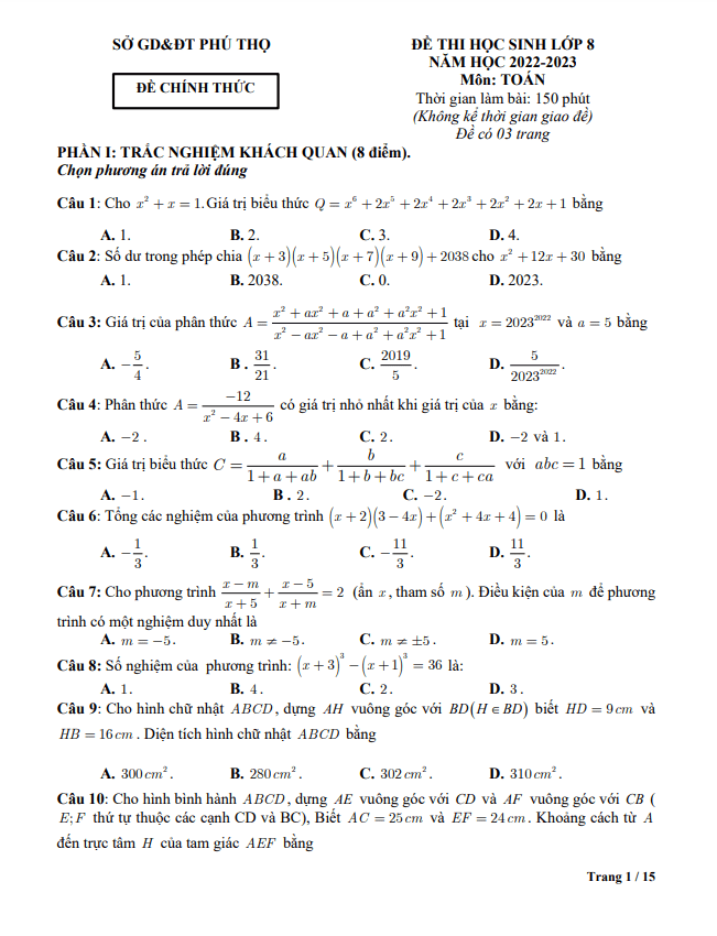 Đề học sinh giỏi cấp tỉnh lớp 8 môn Toán năm 2022 2023 sở GD ĐT Phú Thọ