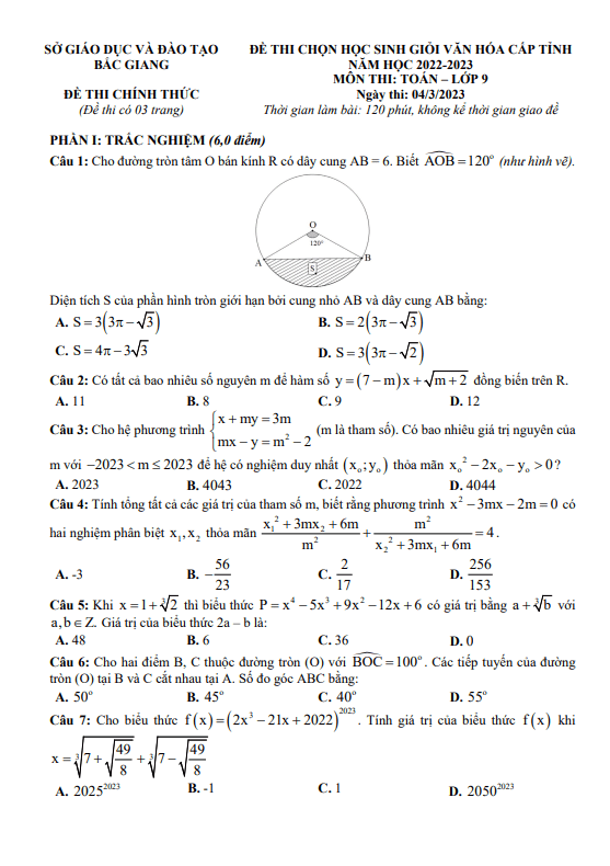 Đề học sinh giỏi cấp tỉnh lớp 9 môn Toán năm 2022 – 2023 sở GD ĐT Bắc Giang