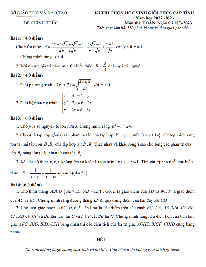 Đề học sinh giỏi cấp tỉnh Toán THCS năm 2022 – 2023 sở GD&ĐT Bình Dương