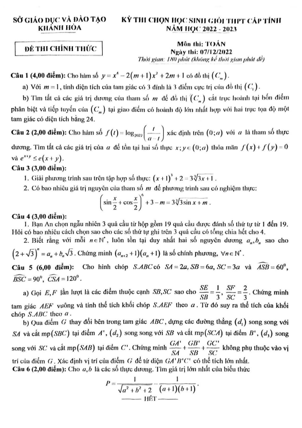Đề học sinh giỏi Toán THPT Khánh Hòa năm 2022-2023