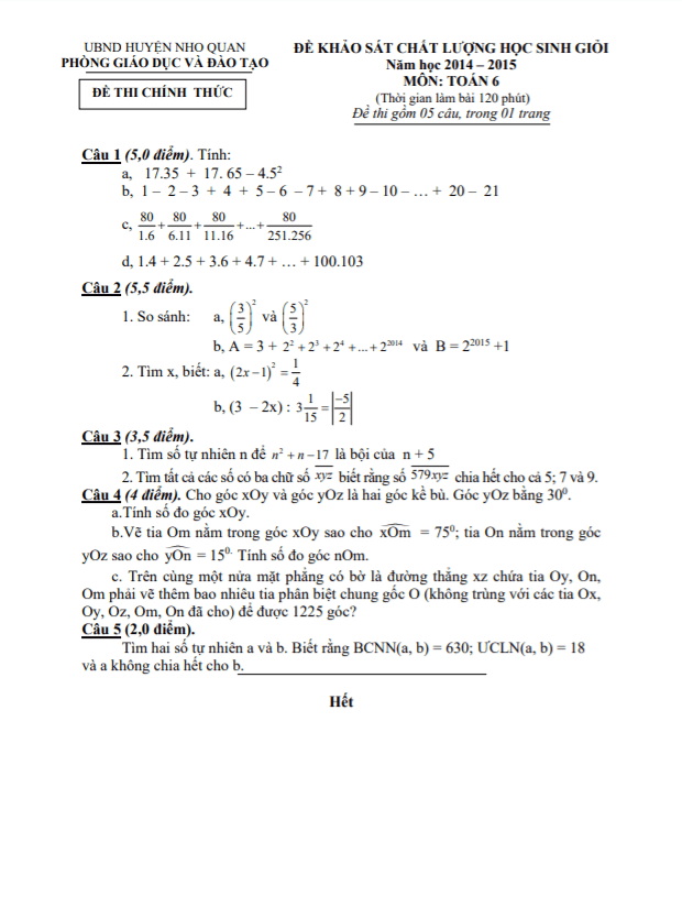 Trích dẫn câu hỏi từ đề học sinh giỏi huyện Toán lớp 6 năm 2014 – 2015 của phòng GD&ĐT Nho Quan – Ninh Bình: