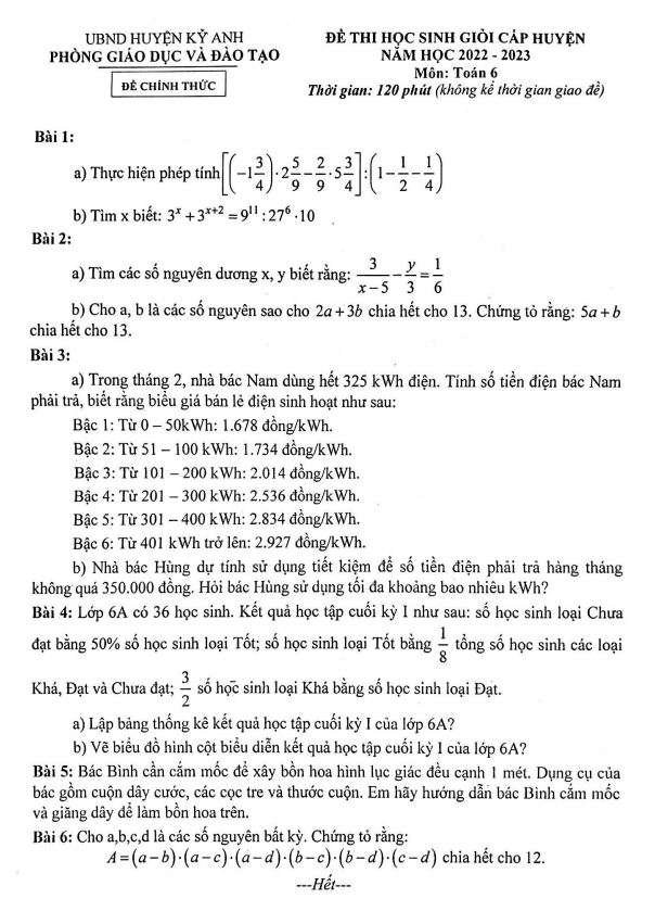 Đề học sinh giỏi huyện lớp 6 môn Toán năm 2022 2023 phòng GD ĐT Kỳ Anh Hà Tĩnh