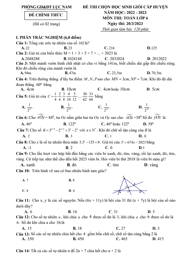 Đề học sinh giỏi huyện lớp 6 môn Toán năm 2022 2023 phòng GD ĐT Lục Nam Bắc Giang