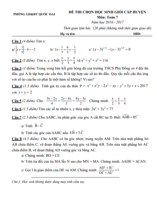 Đề học sinh giỏi huyện lớp 7 môn Toán năm 2016 2017 phòng GD ĐT Quốc Oai Hà Nội