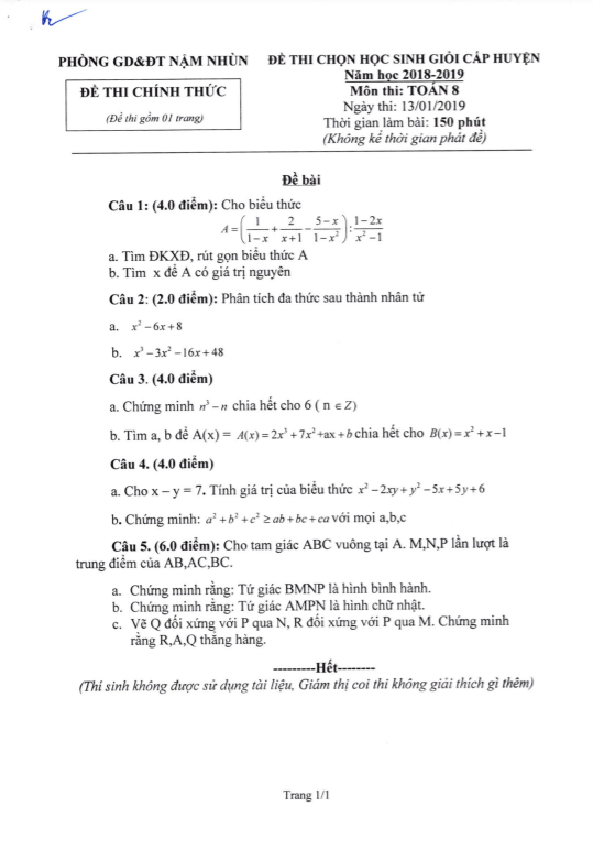Sytu xin gửi đến quý thầy cô giáo và các em học sinh đề thi chọn học sinh giỏi cấp huyện môn Toán lớp 8 năm học 2018 – 2019 của phòng GD&ĐT Nậm Nhùn – Lai Châu. Kỳ thi sẽ diễn ra vào ngày 13 tháng 01 năm 2019, hy vọng sẽ là cơ hội cho các em học sinh thể hiện tài năng và kiến thức trong môn Toán. Chúc các em thi tốt!