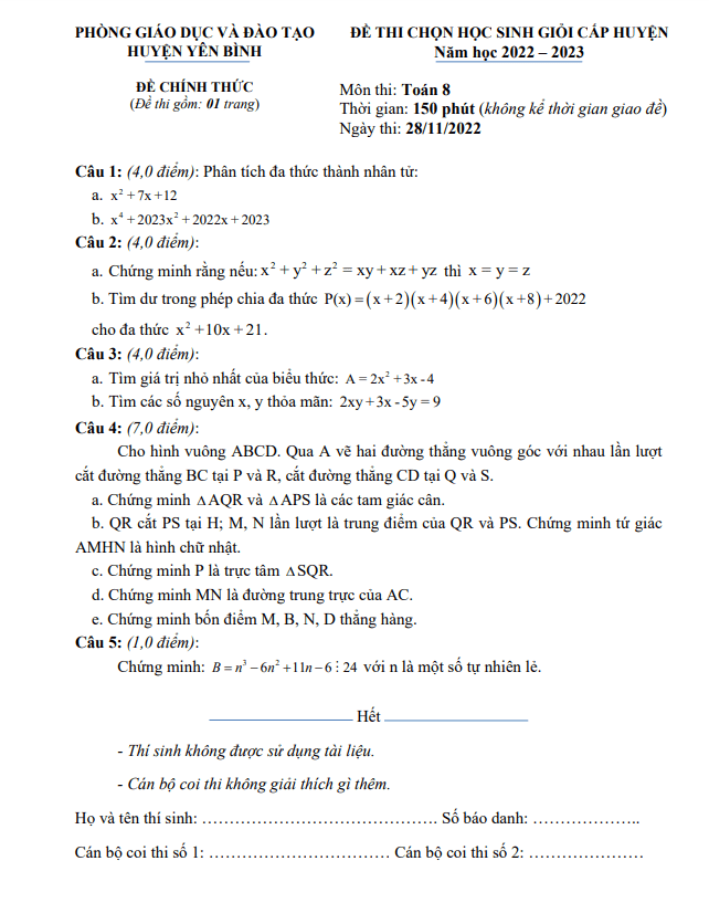 Đề học sinh giỏi huyện lớp 8 môn Toán năm 2022-2023 phòng GD ĐT Yên Bình Yên Bái