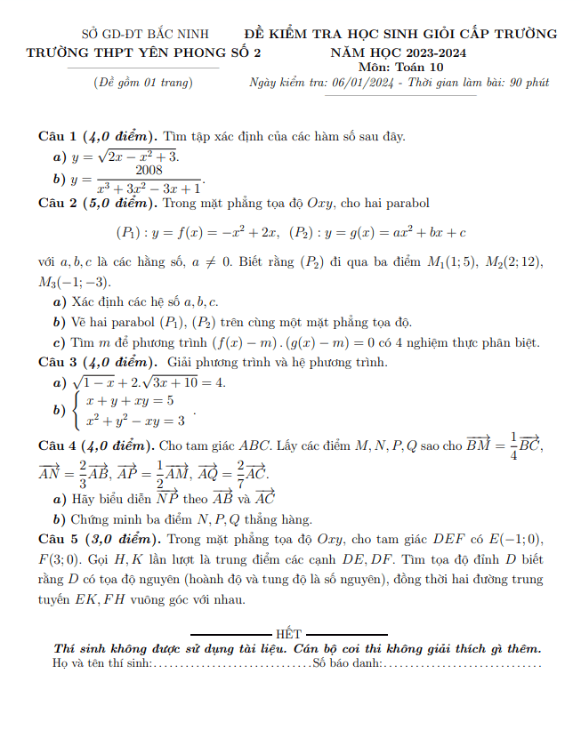 Đề học sinh giỏi lớp 10 môn Toán năm 2023-2024 trường THPT Yên Phong 2 Bắc Ninh
