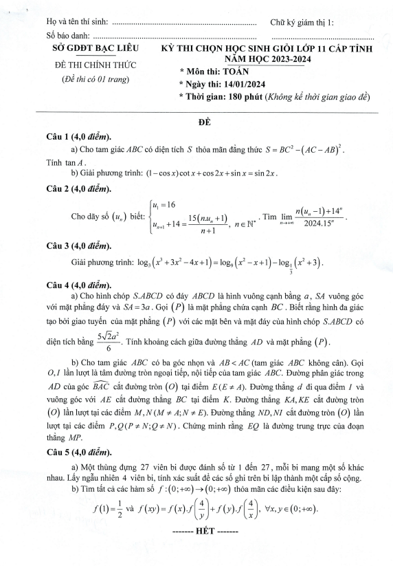Đề học sinh giỏi Toán lớp 11 cấp tỉnh năm 2023 – 2024 sở GD&ĐT Bạc Liêu