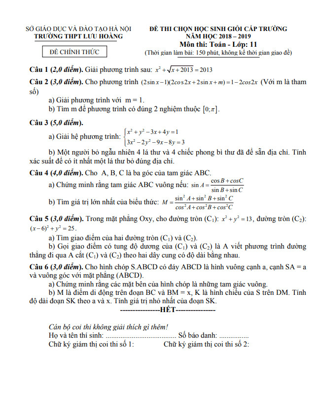 Đề học sinh giỏi lớp 11 môn Toán cấp trường năm 2018 2019 trường Lưu Hoàng Hà Nội