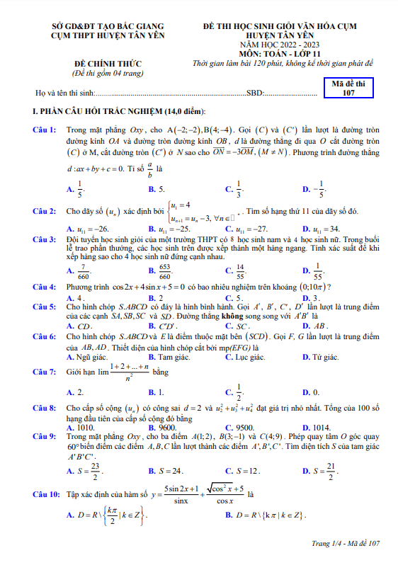 Bạn đang chuẩn bị cho kì thi chọn học sinh giỏi văn hóa cấp cơ sở môn Toán lớp 11 năm học 2022-2023 cụm Tân Yên, tỉnh Bắc Giang? Hãy xem qua đề thi mã đề 107 mà chúng tôi tổng hợp dưới đây nhé!