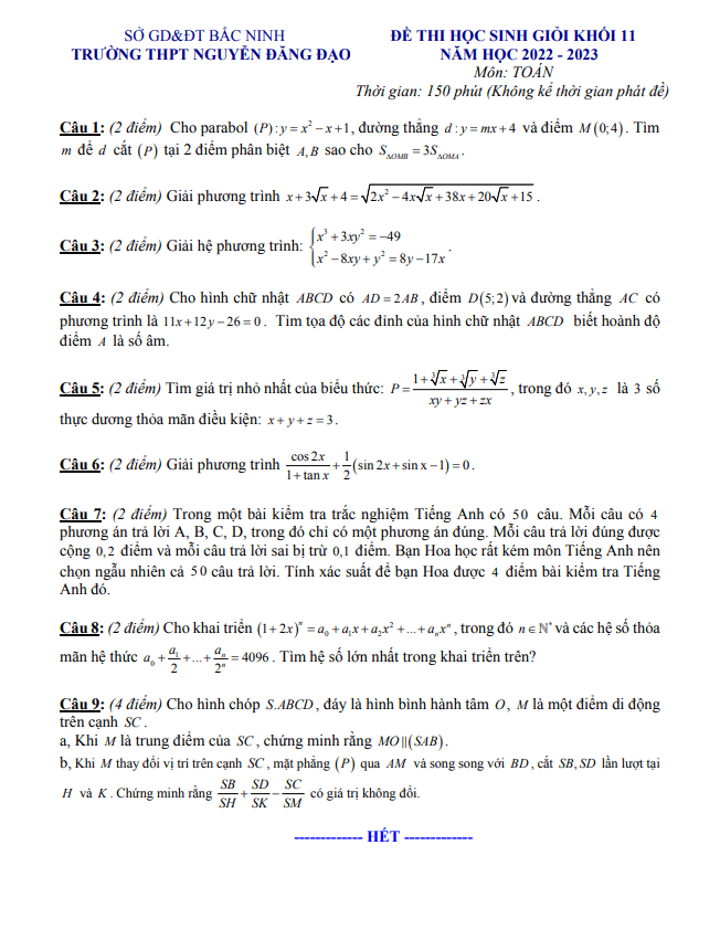 Đề học sinh giỏi lớp 11 môn Toán năm 2022 2023 trường Nguyễn Đăng Đạo Bắc Ninh
