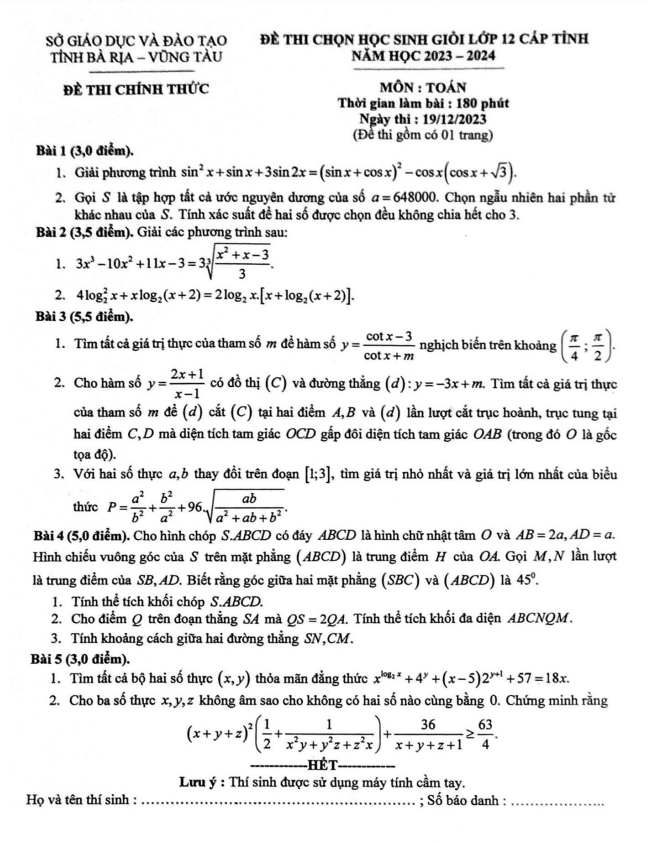 Sytu rất hân hạnh giới thiệu đến quý thầy cô và các em học sinh lớp 12 đề thi chọn học sinh giỏi môn Toán lớp 12 cấp tỉnh năm học 2023 – 2024 sở Giáo dục và Đào tạo tỉnh Bà Rịa – Vũng Tàu. Kỳ thi sẽ diễn ra vào thứ Ba ngày 19 tháng 12 năm 2023.