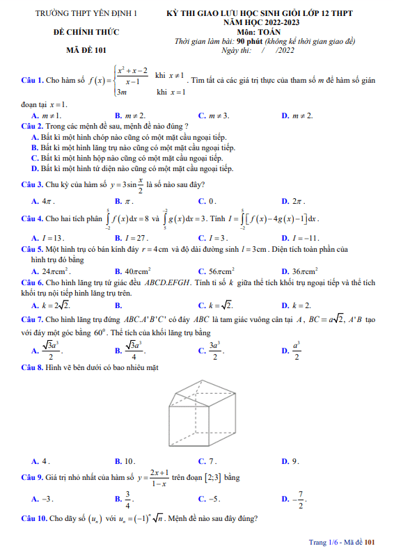 Đề học sinh giỏi Toán lớp 12 năm 2022-2023 trường THPT Yên Định 1 – Thanh Hóa