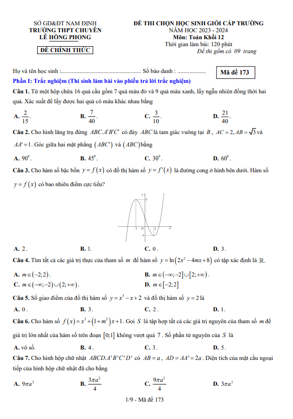 Đề học sinh giỏi lớp 12 môn Toán năm 2023 2024 trường chuyên Lê Hồng Phong Nam Định