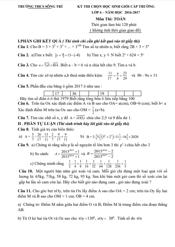 Đề học sinh giỏi lớp 6 môn Toán cấp trường năm 2016-2017 trường THCS Sông Trí Hà Tĩnh