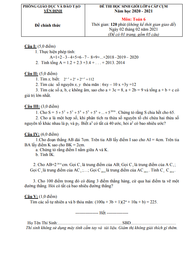 Đề học sinh giỏi lớp 6 môn Toán năm 2020 2021 phòng GD ĐT Yên Định Thanh Hóa