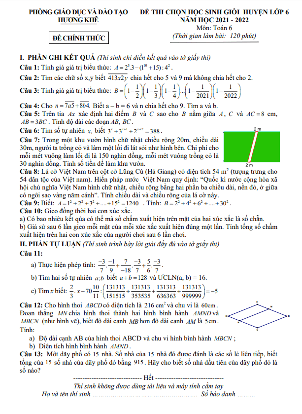 Đề thi học sinh giỏi Toán lớp 6 năm 2021-2022 phòng GD&ĐT Hương Khê – Hà Tĩnh