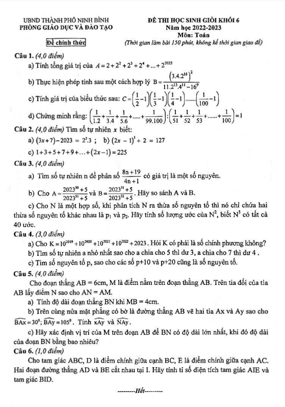 Đề thi học sinh giỏi lớp 6 môn Toán năm 2022-2023 tại Ninh Bình