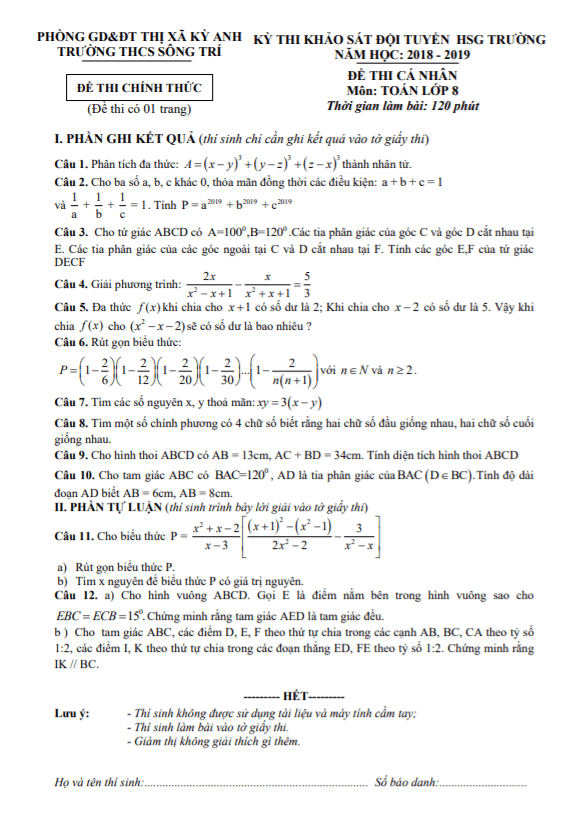 Đề học sinh giỏi Toán lớp 8 cấp trường năm học 2018 – 2019 trường THCS Sông Trí Hà Tĩnh