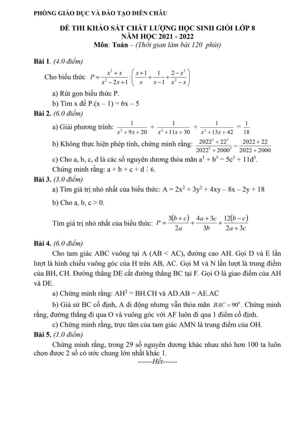 Đề học sinh giỏi Toán lớp 8 năm 2021 – 2022 phòng GD&ĐT Diễn Châu