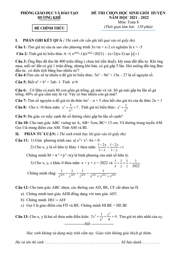 Đề học sinh giỏi lớp 8 môn Toán năm 2021 2022 phòng GD ĐT Hương Khê Hà Tĩnh