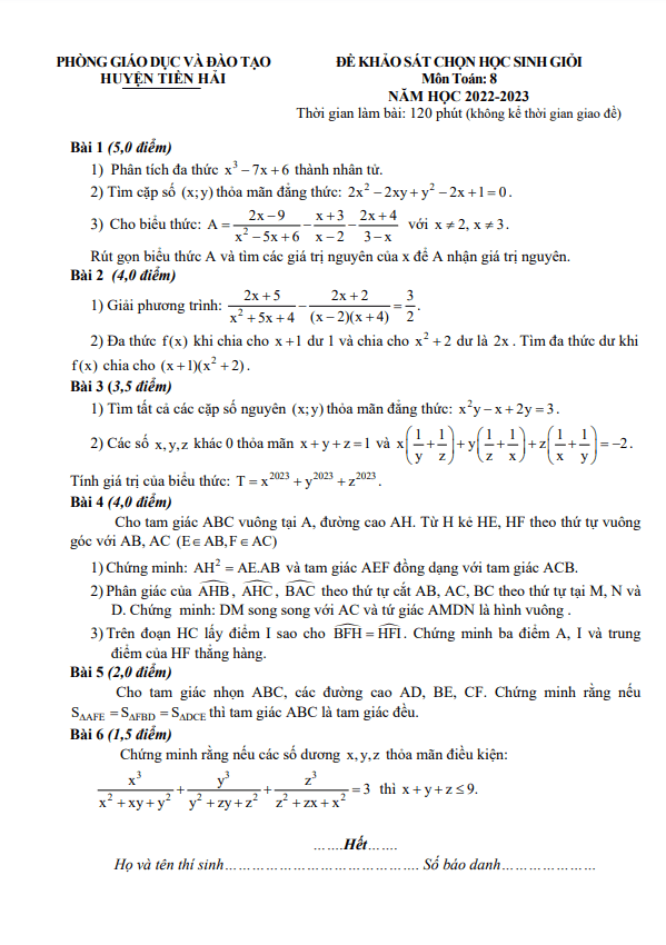 Đề Học Sinh Giỏi Toán Lớp 8 Năm 2022 – 2023 Phòng GD&ĐT Tiền Hải – Thái Bình