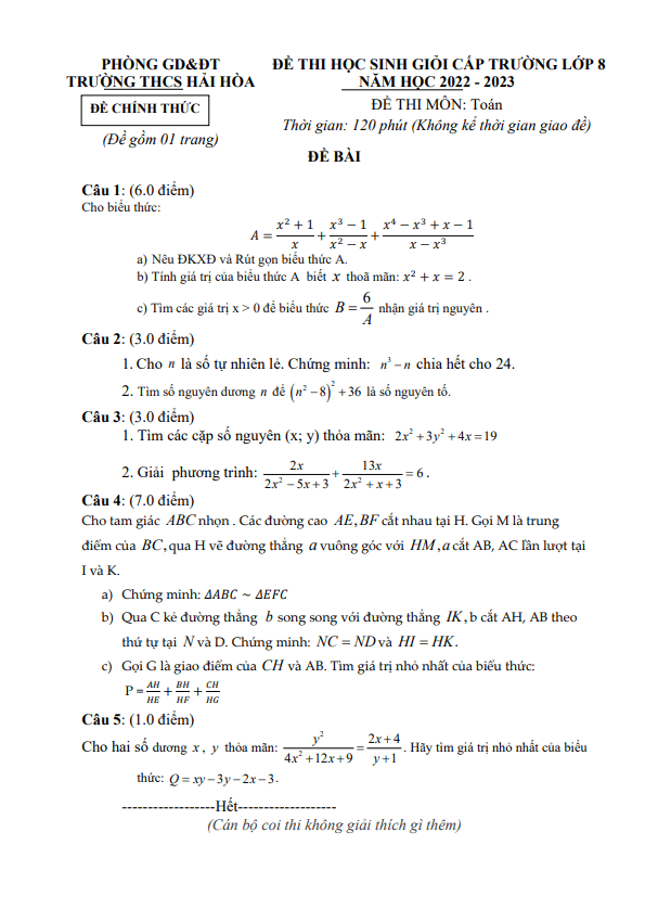 Đề học sinh giỏi Toán lớp 8 năm học 2022 – 2023 trường THCS Hải Hòa Nam Định