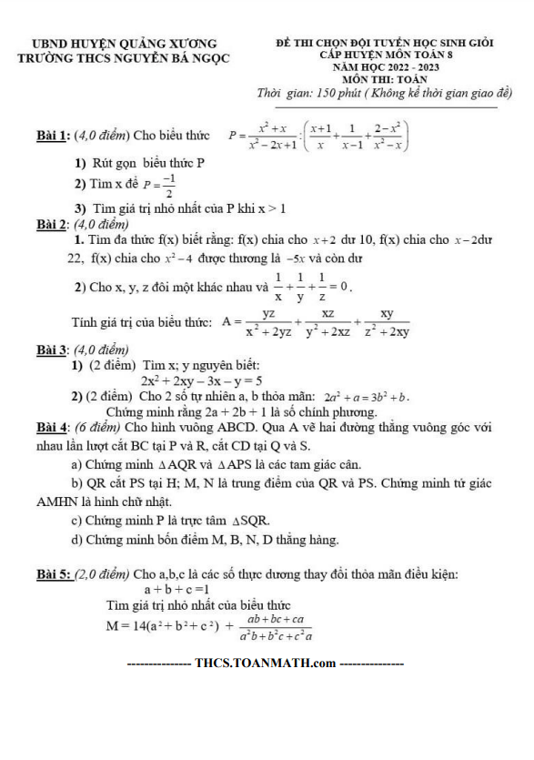 Chào mừng đến với đề thi chọn đội tuyển học sinh giỏi cấp huyện môn Toán lớp 8 năm học 2022 – 2023 tại trường THCS Nguyễn Bá Ngọc, huyện Quảng Xương, tỉnh Thanh Hoá. Đề thi sẽ bao gồm 01 trang với 05 bài toán dạng tự luận, với thời gian làm bài là 150 phút. Đề thi sẽ có đáp án và lời giải chi tiết giúp các em học sinh hiểu rõ hơn về từng bài toán.