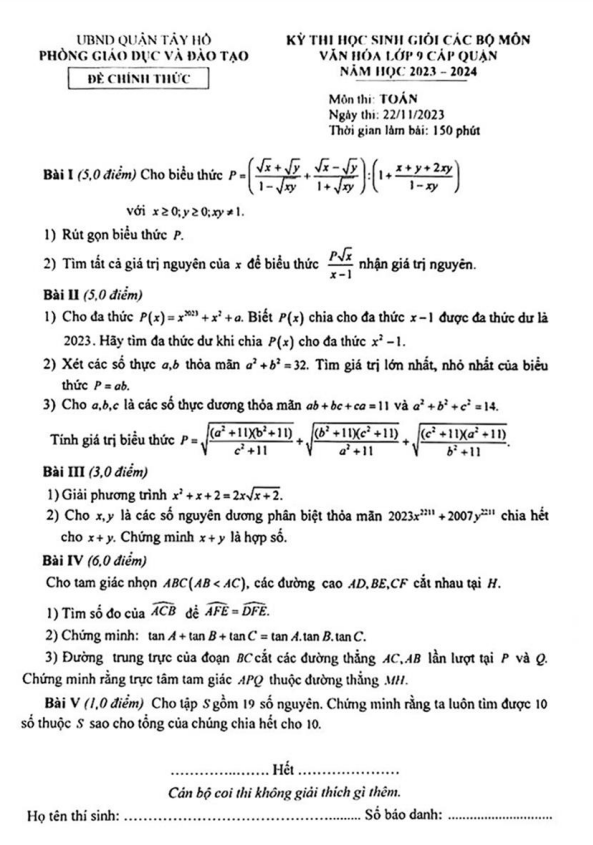 Đề thi học sinh giỏi Toán lớp 9 cấp quận Tây Hồ năm 2023-2024 là cơ hội cho các em học sinh thể hiện tài năng, kiến thức và kỹ năng Toán của mình. Qua đó, không chỉ giúp nâng cao trình độ học vấn mà còn tạo điều kiện tốt để thúc đẩy phát triển tư duy logic, sáng tạo của các em.