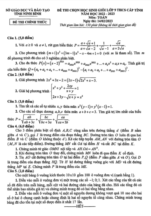 Xin chào quý thầy cô giáo và các em học sinh lớp 9! Đây là đề thi chọn học sinh giỏi môn Toán lớp 9 THCS cấp tỉnh Ninh Bình cho năm học 2022-2023 do Sở Giáo dục và Đào tạo tỉnh Ninh Bình tổ chức. Kỳ thi sẽ diễn ra vào ngày 14 tháng 02 năm 2023.
