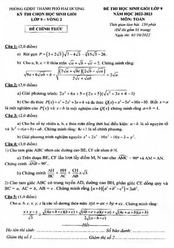 Đề học sinh giỏi lớp 9 môn Toán năm 2022 2023 phòng GD ĐT thành phố Hải Dương (vòng 2)