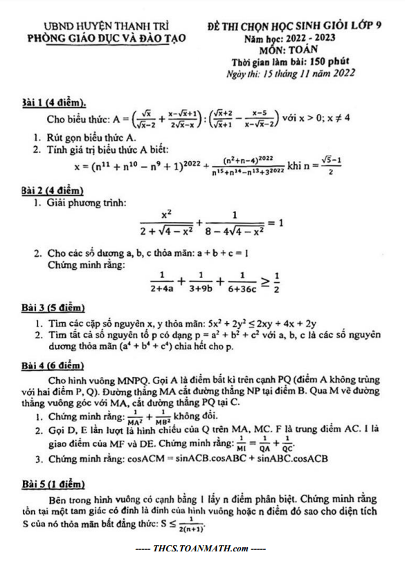 Đề thi học sinh giỏi Toán lớp 9 năm học 2022 – 2023 phòng GD&ĐT Thanh Trì Hà Nội