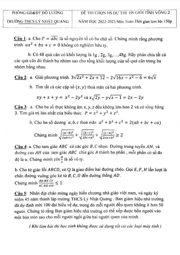 Đề thi học sinh giỏi Toán lớp 9 trường THCS Lý Nhật Quang Nghệ An (vòng 2) năm 2022 – 2023