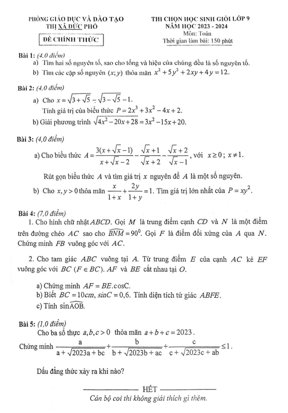 Đề học sinh giỏi lớp 9 môn Toán năm 2023 2024 phòng GD ĐT Đức Phổ Quảng Ngãi
