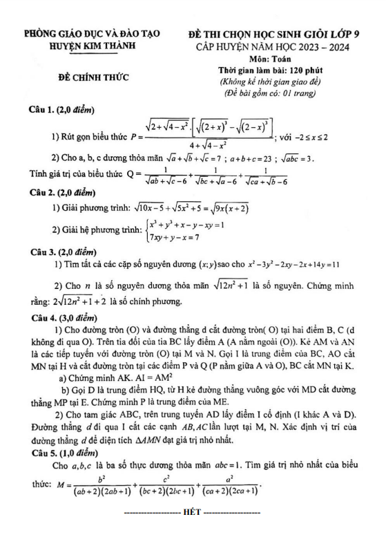 Xin chào quý thầy cô giáo và các em học sinh lớp 9! Hôm nay, Sytu xin giới thiệu đến quý vị đề thi chọn Học sinh giỏi lớp 9 môn Toán cấp huyện năm học 2023-2024 của phòng Giáo dục và Đào tạo huyện Kim Thành, tỉnh Hải Dương.