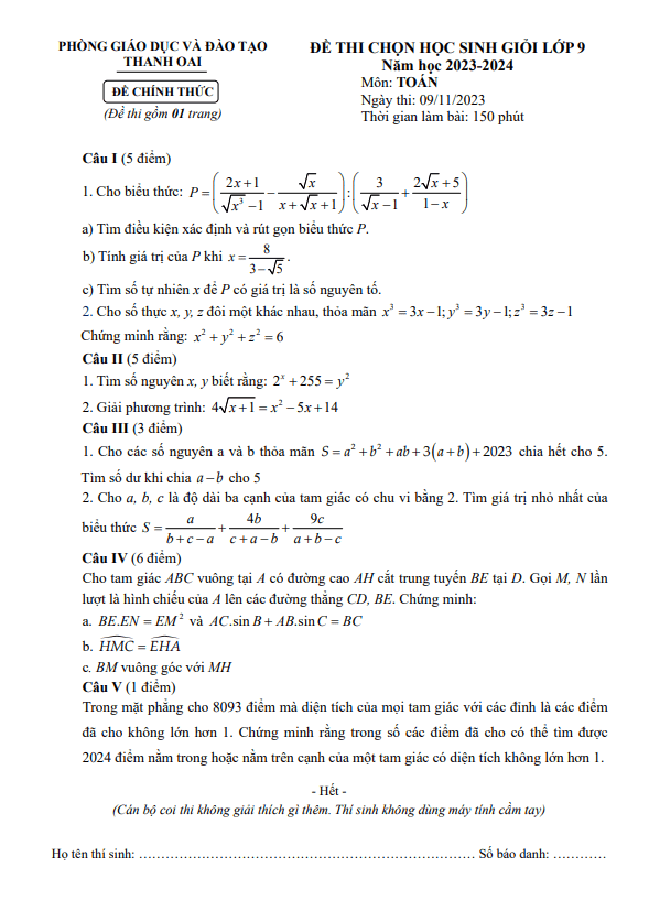 Đề thi học sinh giỏi Toán lớp 9 năm 2023 – 2024 phòng GD&ĐT Thanh Oai Hà Nội