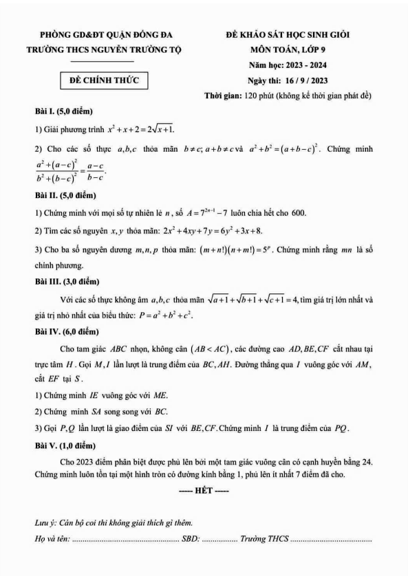 Chúng ta sẽ cùng tìm hiểu về đề khảo sát chất lượng học sinh giỏi môn Toán lớp 9 năm học 2023 – 2024 của trường THCS Nguyễn Trường Tộ ở Hà Nội. Đề thi diễn ra vào ngày 16 tháng 09 năm 2023 với các câu hỏi hấp dẫn và thú vị như sau: