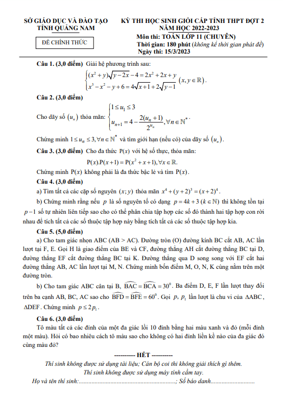 Đề Học Sinh Giỏi Tỉnh Lớp 11 Môn Toán Chuyên Đợt 2 Năm 2022-2023 Sở GD&ĐT Quảng Nam