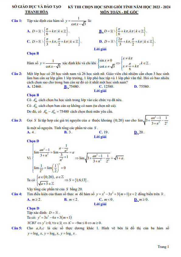 SyTu kính gửi đến quý thầy cô và các em học sinh lớp 12 bộ đề thi chọn học sinh giỏi cấp tỉnh môn Toán THPT năm học 2023-2024 của sở Giáo dục và Đào tạo tỉnh Thanh Hóa (mã đề GỐC). Bộ đề gồm 8 trang, bao gồm 50 câu hỏi và bài toán dạng trắc nghiệm, thời gian làm bài 90 phút, kèm theo đáp án và lời giải chi tiết.