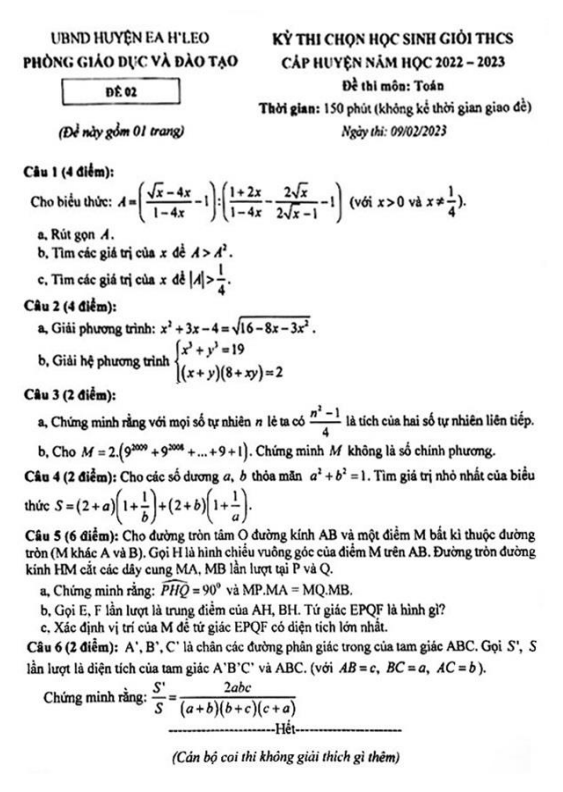 Trích dẫn một số câu hỏi từ Đề học sinh giỏi Toán THCS năm 2022-2023 phòng GD&ĐT Ea H’Leo Đắk Lắk: