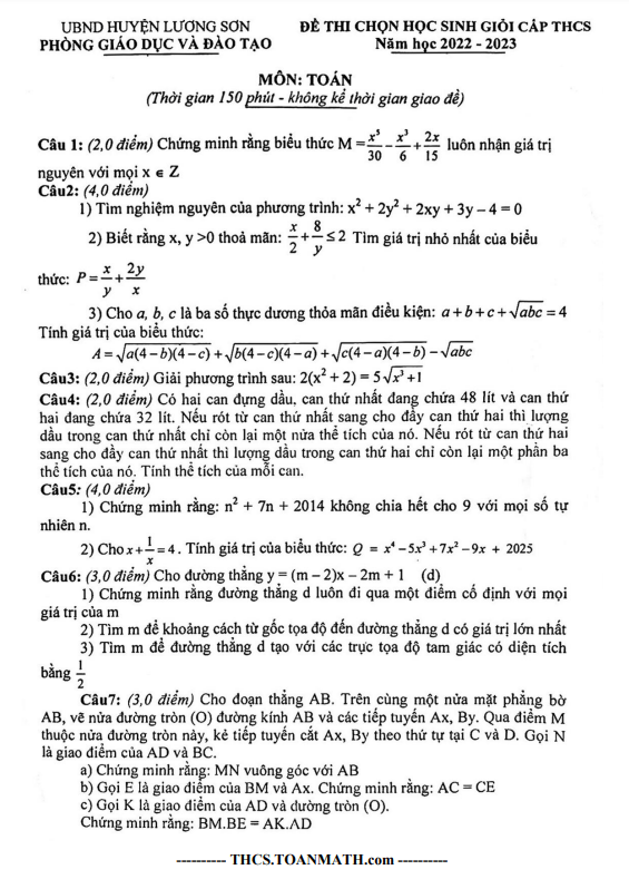 Dưới đây là một số câu hỏi trích từ Đề học sinh giỏi Toán THCS năm 2022-2023 do phòng GD&ĐT Lương Sơn – Hòa Bình ra: