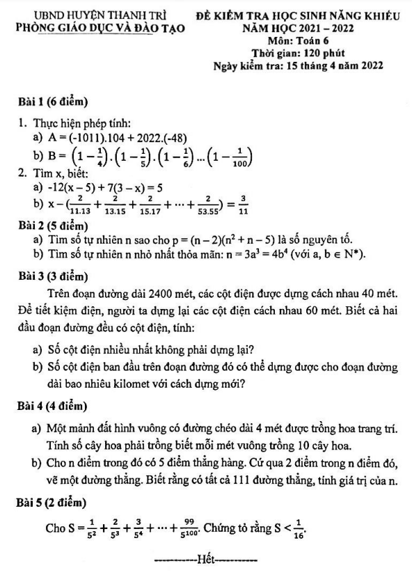 Đề thi học sinh năng khiếu Toán lớp 6 năm 2021-2022 phòng GD&ĐT Thanh Trì Hà Nội